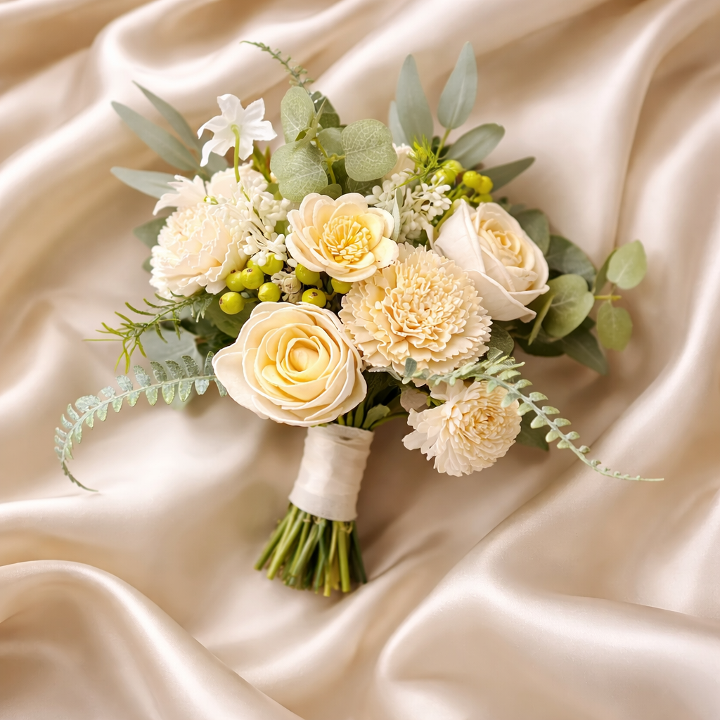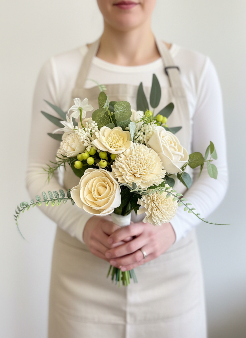This champagne and off-white wood flower bouquet features hand-finished blooms, soft greenery, and premium ribbon detailing in an airy, modern style. Each piece is lightweight, durable, and designed to photograph beautifully.