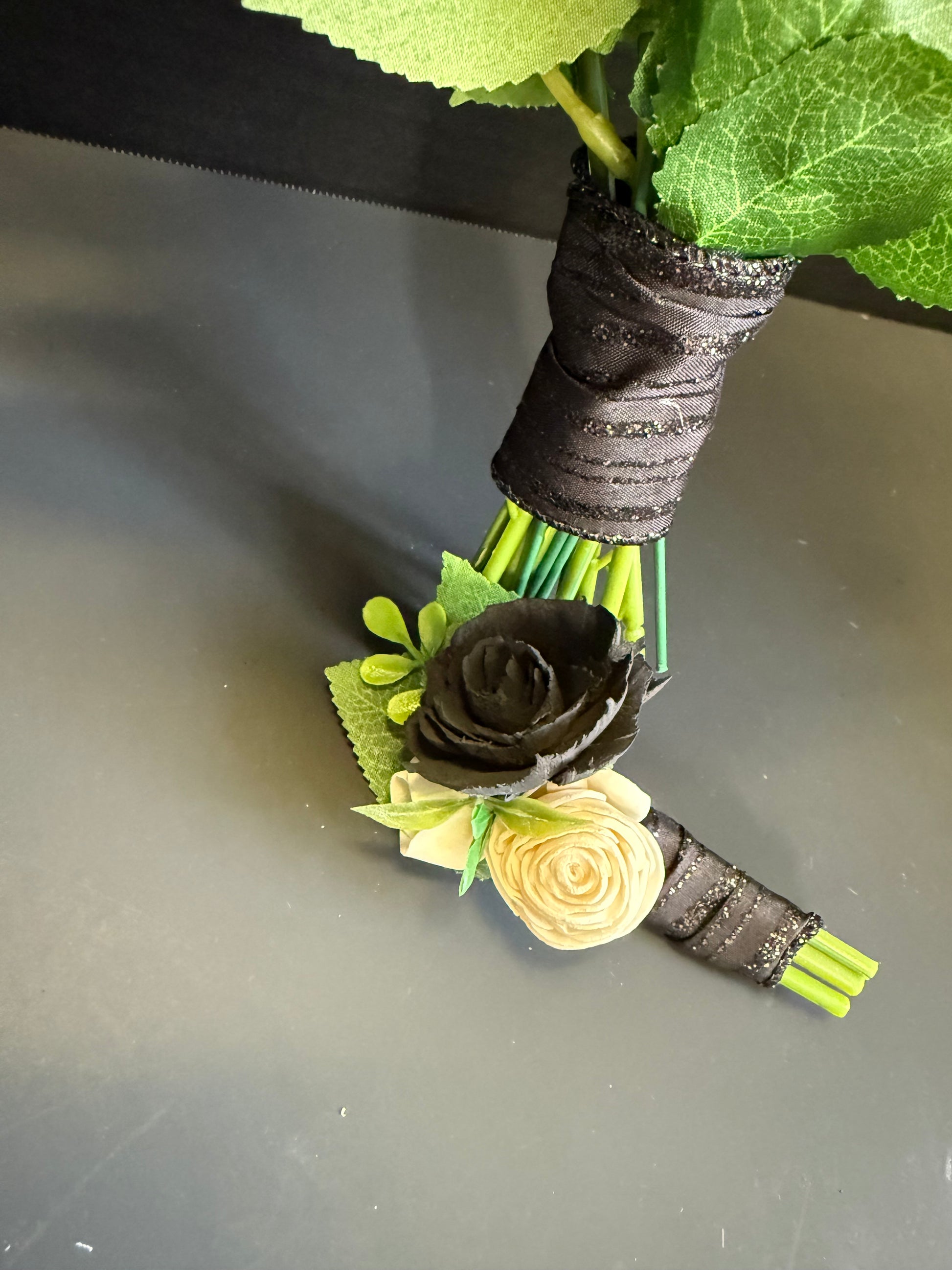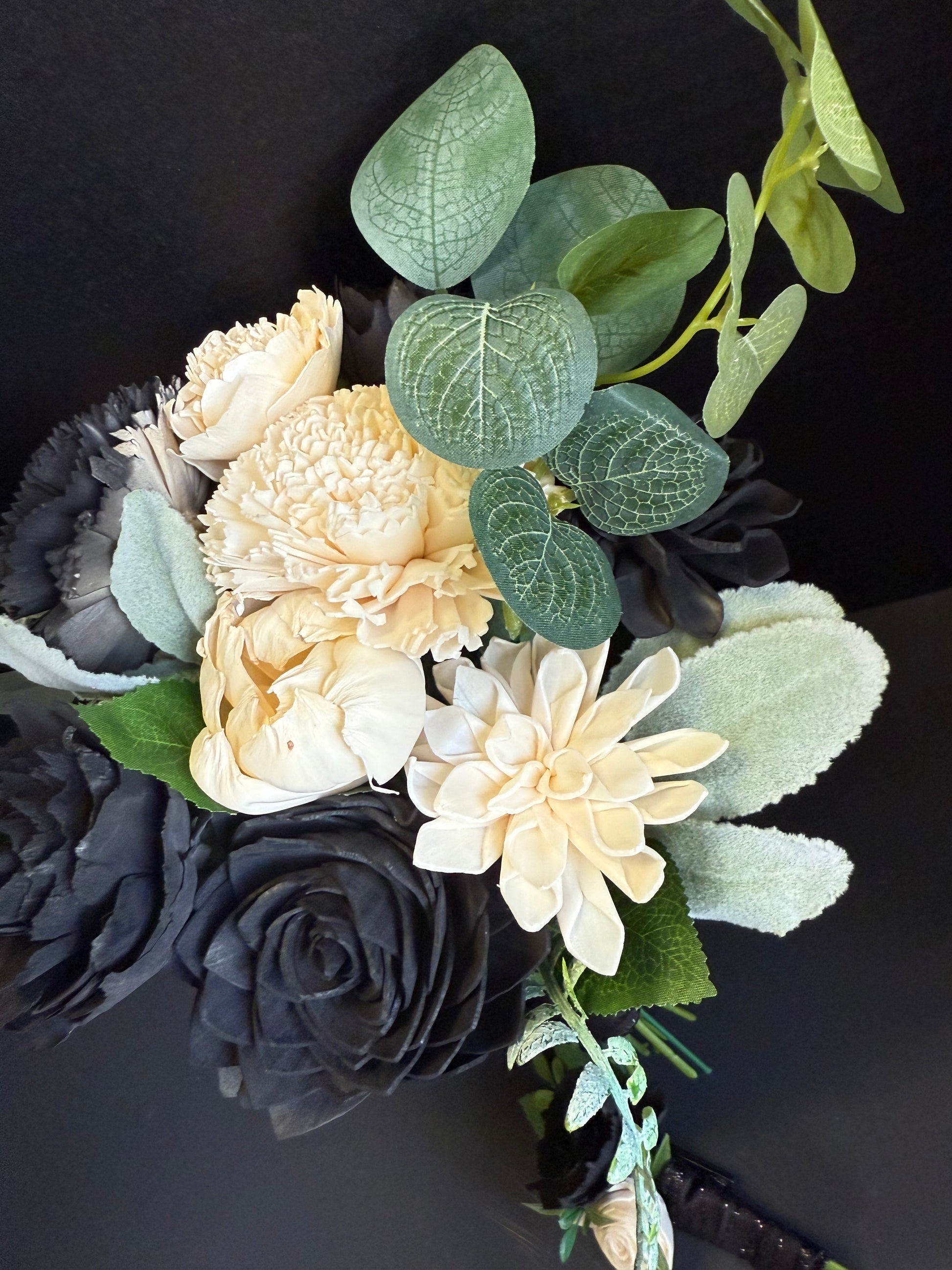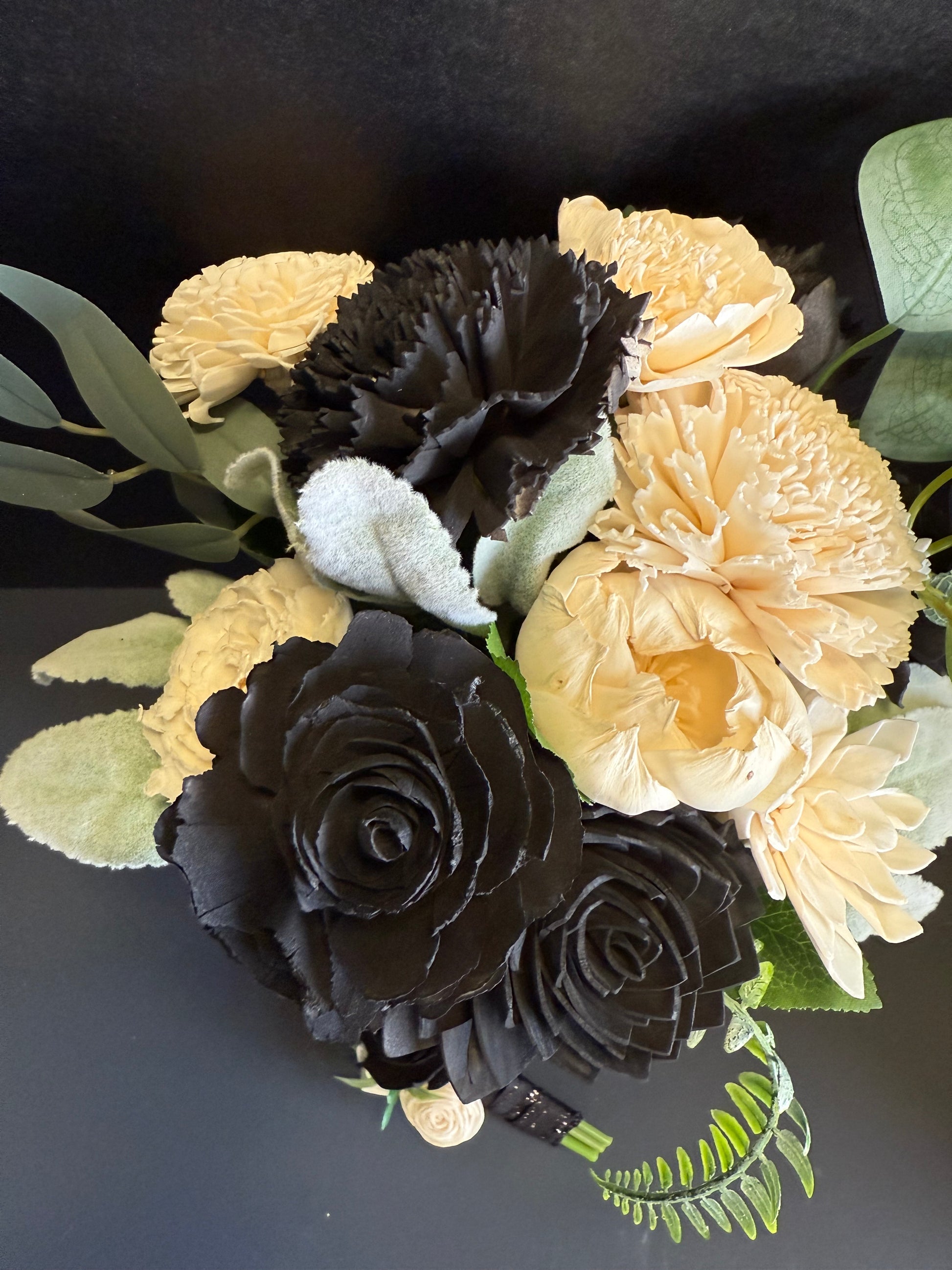 Midnight Black & Ivory Prom Bouquet Set | Wood Flower Keepsake | Boutonniere or Arm Garter
